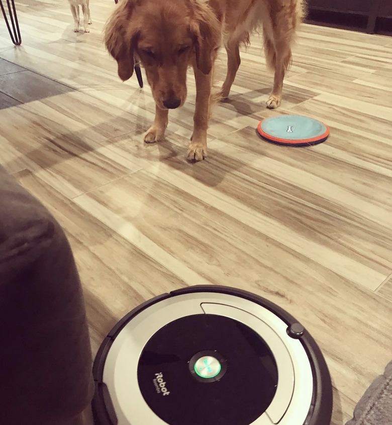 Dogs and round little robots that zoom around eating everything in their path are not natural friends, but perhaps they are not enemies either. Learning to coexist is a beautiful thing.