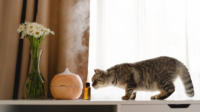 The hazards of essential oils often come as a surprise to pet owners, so the safest choice is to simply not use them on or around your cats. Remain alert to the signs of essential oil toxicity, which may include lethargy, drooling, vomiting, and tremors, per PetMD. Purple gums and abnormal breathing, including breathing with an open mouth or taking more than 40 breaths per minute, number among the signs that your cat is having a genuine medical emergency and needs to go to the veterinarian or an emergency clinic immediately. Some of the most dangerous essential oils for cats include peppermint, tea tree, clove, and eucalyptus, but this is not an exhaustive list.
