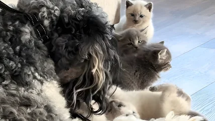 It's a lot of work being a single dad. Just ask Rock, a Bernedoodle who's appointed himself the father of five rambunctious little kittens. Owner Jessica Mixon has posted numerous videos on TikTok that show the adorable Bernedoodle (a cross between a poodle and a Bernese mountain dog) doting on the five fuzzballs. In one video that's been viewed more than 576,000 times, the proud pooch papa pulls back a blanket on the couch to reveal the kittens all squished together in a cozy cuddle puddle. His demeanor suggests a loving but weary parent who's just managed to get his babies to lie down for a nap.