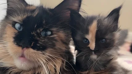 Sometimes, a kitten looks nothing like its mother. Other times, the mama and baby look so similar that there's no doubt whatsoever about parentage. In a TikTok video that's been viewed more than 10,000 times, a tortoiseshell Maine coon mother and her lookalike kitten are cuddled together, and the kitten's head pops up in the cutest way to gaze at the camera.