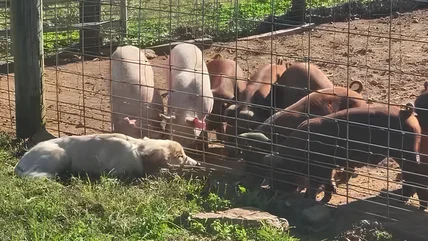 At first, Poppi is frightened and runs away. "They oinked once...and she was outta there," reads the text overlaid on the video. But soon, Poppi decides to come back for another look at these unusual creatures, sniffing them through the fence. She becomes more and more interested in the pigs, wagging her tail happily as she gives them kisses, then she lies on the ground to watch them, looking completely enamored with her new chums. "Now she's officially part of the pig pack," reads the final text.