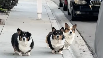 We've all been there, walking down the street, minding your own business, when an awkward encounter unexpectedly presents itself and stops you dead in your tracks. Usually, though, the situation isn't as cute as this one, where a TikTok dachshund named Tofu the Weenie comes face-to-face with three unaccompanied corgis, all lined up and looking like they mean business.