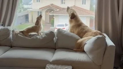 Captured on a doggy cam while no one's around, the two dogs are seen sitting by an oversized window, barking at the outside world. But as the goldie named Bailey begins to howl, the mini doxie named Winnie thinks it's time to step up her game, finding her own inner howl in no time. "Please enjoy my golden teaching my dachshund how to howl 😅," notes the TikTok creator as the two dogs bark and howl in unison, before asking if anyone else's dachshund vocalizes like that.