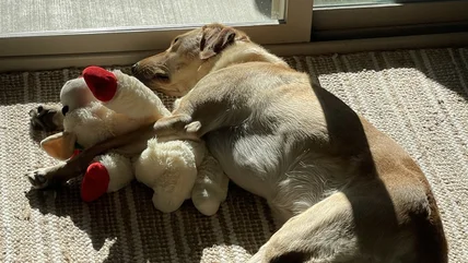 Yellow Lab Snuggling With Toddler Sister's Toy While She's Not Home Is Pure Love