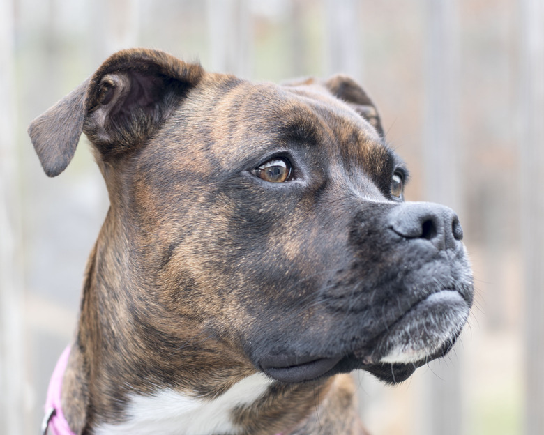 Many dogs have a unique coloring called a brindle, which appears as either brown or a dusky tawny color with streaks of other colors mixed in. Brindle dogs have black stripes running across their body in the same direction as the ribs. Technically brindle is a marking pattern, but for ease of use most people refer to it as a color. Many breeds display a brindle coat, so determining the breed of a brindle dog depends on other factors.