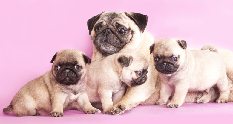 A pug is pregnant for an average of 63 days, or about 9 weeks. Litter sizes typically range between three and five puppies, though it's not unusual for a pug to produce just a single puppy. Put together a whelping box, using a cardboard box and a thick layer of newspapers, choosing a quiet, comfortable space in your house. After the puppies are born, you can remove the soiled newspaper and provide comfortable bedding, such as a dog bed or blankets or towels for your pug to use for nesting and caring for her litter. Watch for signs your pug is ready to give birth during the first stage of labor, including: